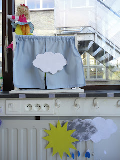 Het weervrouwtje kijkt samen met de kleuters welk weer het is buiten.